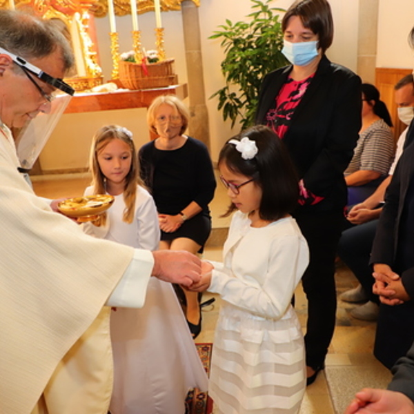 46 Kinder feierten in diesem Jahr Erstkommunion. Aufgrund der Corona-Abstandsregeln fanden diesmal drei Feiern statt: am Samstag 19. Sept. um 10.00 Uhr und um 13.30 Uhr; am Sonntag 20. Sept. um 10.00 Uhr.