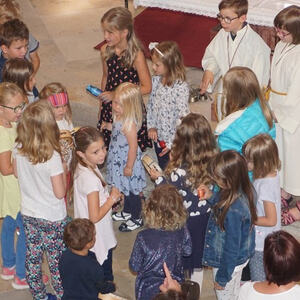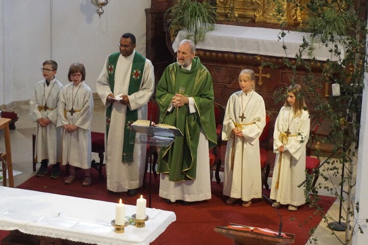 Sophie und Daniel ministrieren seit ihrer Erstkommunion. sie bekommen ein Geschenk von der Pfarre und ein Kreuz, das sie während ihres Dienstes immer begleitet hat.