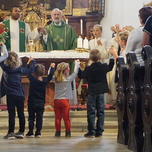 "Jesus, ich bau auf dich" erklingt es im Kirchenraum, begleitet von Kinderstimmen, Rasseln, Triangeln und Orchesterinstrumenten.